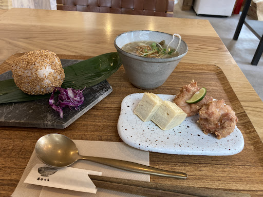 おにぎりセットを注文。 金ごまのおにぎり、美味しい。 ご飯がふかふか。ゴマも際立つ。 ザンギと卵焼き、まあまあ。 豚汁、うまー。 個人的にフライドポテトが入ってるのが最高。 ムラサキキャベツの何か…何だろう。浅漬け? ドリンクも着いてきます。 ほうじ茶ラテ。甘さもミルク具合も絶妙。凄い好みのラテだ!