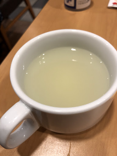 水曜日の日替わりは「ハンバーグトマトソース&白身魚フライ」税込み549円ですよ。 もちろん無料のライス大盛で(笑) 注文が思ったので、ドリンクバーコーナーで無料の「おいしい水」を頂きますか? で、チラッとスープを見てみると、今日は「なんちゃら国たまごスープ」ではありません。 「チキン風味たまごとコーンのスープ」ですかぁ。 席に戻って冷たい水を飲んで一息。