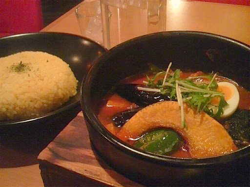 が到着しました。 普段スープカレー屋で見るメニューではないのでどうかなと思いましたが、 これが沢山のモツや煮込んだナスやキャベツ、オクラやコンニャク等の煮込まれたコクのある味がかなりオススメ! 大変美味しかったです。