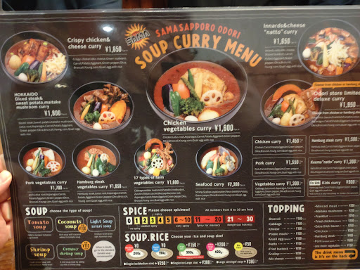 Read moreHokkaido is famed for it's soup curry and this place is a great example of this dish. While it's not the best I've ever had, it is still a great place to stop by and have some soup curry. The curry is a but more watery and soupy compared to other Japanese curries which are thicker in consistency and less spicy. The restaurant is located on the second floor and can accommodate small to medium parties. The menu is diverse and other than different in toppings, you'll be able to order different soup bases as well as the spice level. I had the hamburg steak in the shrimp soup curry at spice level 5. The soup was just spicy enough and fragrant and paired well with the generous amount of vegetables in the soup. The prices are fair and the staff are really friendly. Definitely give this place a try if you're in the mood for...