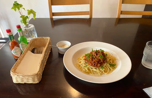 ミートソース 麺は硬めと柔めだったら柔め側に入る。 硬すぎず柔すぎずの中間くらいだ。 肉はトマトベースの果肉入りでまろやか。 チーズはパルメザンチーズで刷ったものを使用 時々チーズをかけ、混ぜながら食べ進めていくと変化があり、途中から黒胡椒とミートソースの肉汁で食欲を増進させる旨さがある。 (タバスコは無理な人ですどうも) 白いお皿のまま終わりたかったが黒胡椒が肉汁の上に浮かぶので困難を極めたのでやめた。 肉は全部食べましょう。好きでしたね。
