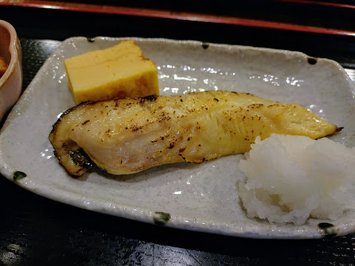 この日の内容はメインに厚焼き玉子が添えられた「銀だら」の西京漬け焼き、サーモンの刺身、若鶏の唐揚げフライドポテト付き、サラダ、味噌汁、白飯、たくわんという内容でコスパは良い感じです♪