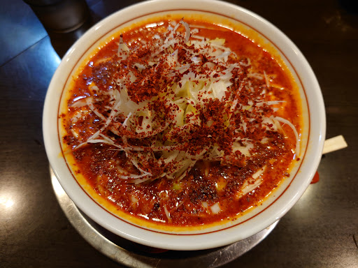 通る度に気になってた、なかなか入り口のラーメンの写真のインパクトが凄いラーメン屋さん。 ニラがたっぷりのニラ醤油(青鬼)をオーダー。 店員さんに、激辛か超激辛どちらにしますか?と聞かれ、店の辛さの基準がわからないので安牌を取り、激辛に。