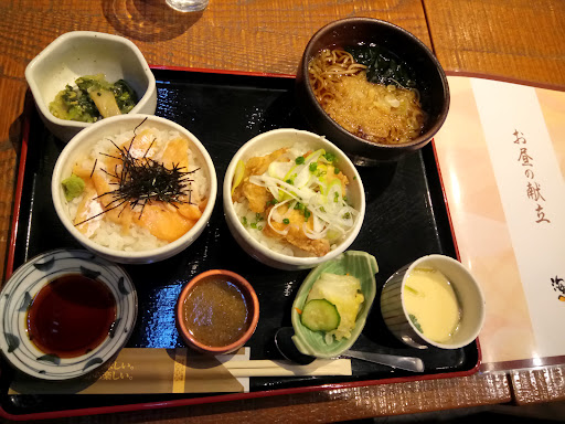 Dropped in here when they nearly closed. The service was not bad but I could feel they wanted me to leave as soon as possible. I ordered two small donburis set. It came with soba noodles, egg custard and pickles. Good value while too much rice is served (but that's my choice so I should blame myself). I needed to get water by myself as everyone was so busy with packing. If you want to relax after a late lunch, this place is not ideal as they are close at 3pm. The place also smells...