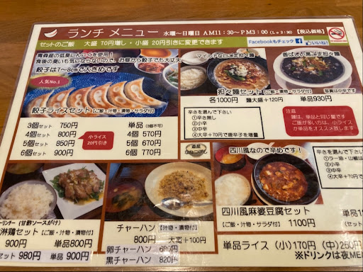 南郷通沿いから向ヶ丘通を札幌ドーム方面に走った先にある住宅街に佇むお店です。 ここでは、ぎょうざをはじめ、麻婆豆腐や担々麺が美味しいとの噂により、日中に来店。 今回は、人気ナンバー1のぎょうざライスセットを注文。セットのぎょうざは、3個から選べます(1個増えるごとに+50円) 正直、仕事中なのでぎょうざはちょっと遠慮しようと思っていましたが、低臭にんにくを使用と書かれていたので安心して注文しました。 待つこと数分、出てきたのは子供の握りこぶしくらいある大きなぎょうざがやってきました。早速、一口食べると皮がモチモチ、肉汁ジュワッ&ニンニクのピリ辛さがお口の中に広がり、あっという間に平らげてしまいました。 ここでは、作り置きをせずに毎朝手作りでぎょうざを作る為、ぎょうざがなくなり次第終了となります。また、ぎょうざの皮や豚肉、具のキャベツは道内産を使用と言う徹底ぶり(これは旨いわけだ) 次回は、水木金曜日限定の新メニュー「きのこのあんかけ焼きそば」をぜひ食べてみたいと思います。 駐車場は、店の横に3台(...