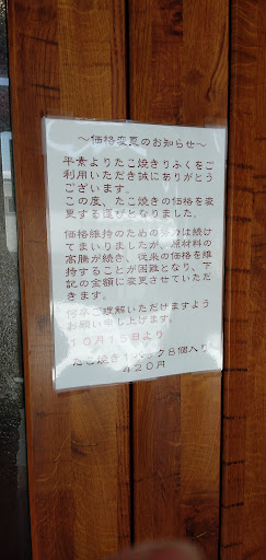 Read more【駐車場3台くらい】 2012(平成24)年にオープンしました。 土日と月曜祝日は寿司屋として、平日はたこ焼き屋として営業しています。 自宅兼店舗です。ドアを開けると、生活感のある玄関で戸惑いました(笑)。奥から店主が出て来て「注文を受けてから焼くので、15分くらい掛かります」と言われました。1パック8個入りで420円。前払いです。呼び出しベルを渡され、駐車場で待ちます。しばらくすると、店主が外に出て来てくれて手渡されました。ベル鳴ってない(笑)。 たこ焼きは、出来立て熱々。生地がふわとろ。出汁がきいていて、美味しかったです😊。柔らかいたこがいくつも入っているし、1個が大きくて食べ応えがありました。 「築地銀だこ」では、1パック8個入りが669円。 420円はかなり安い...