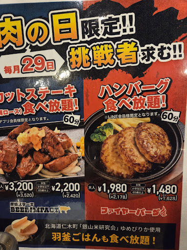 Read more2024.4 期間限定のミスジ200gステーキを、ガーリック多めで注文しました。ステーキソースは玉ねぎベースと、ガラナの入ったものがありましたが、どちらも甘目の味付けです。また山葵、醤油も用意されています。 引き続きのインフレの中、90年代前半か、もしかしたら80年代にも近づく円安にもなった中、価格維持に務められている様でした。格安ステーキチェーンの元祖「いきなりステーキ」が出店減少の中、こちらは狸小路に2店目が出来るというから、沖縄の「やっぱりステーキ」とともに、攻めの戦略なのだろうか。 2023.3 コロナと東欧での戦争によるインフレで、外食全般に影響していますが、こちらもビーフインパクトステーキ250gが¥1950円と、2021年より10%強の値上でした。以前あったガーリックトッピング増し等の設定は、メニュー表にはありませんでした。ガーリックライスセットは、熱せられた鋳鉄製器の底部に肉片を入れ、その上に白飯、フライドガーリックが載せられた状態で提供されるので、炒めらたものを希望する向きには、余熱がある内に、自分でかき混ぜ炒め、その後で添えられた専用ソースで味付けする事をお勧めします。 2021.10...