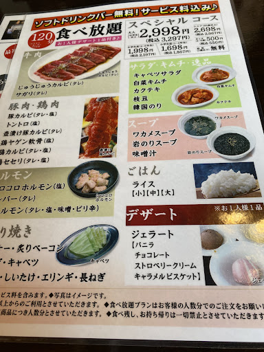 ディナーにて来店。ウルトラコース、デラックスコースと食べ放題の種類が二つありました、ウルトラコースを注文しましたが、全体的に見て肉の品質が悪い、牛サガリもゴムみたいに硬かったです(これは仕方ないかもしれないが)カルビも着皿の段階でもう色が赤くない状態で悪かったです。ハンバーグも生ということで、写真も赤いハンバーグで珍しかったので注文しましたが、来た段階で灰色になってました。せせりは色の変化もなく美味しかったです。またデザートに関してですが、1人一皿までの制限がありました、がWEBにその記載なし、せめて制限かけるなら情報くらいちゃんと書いてください。 また、客が最後自分たちしかいなく、閉店も少し近かったのでなるべく片付けたい気持ちはわかるんですが、 店員さんが結構な頻度で皿を片付けに来たり(これは気遣いかもしれないのであまり気にしてません) 、食べ放題の時間は残っていて、ラストオーダーの時間でもないのに、店員さんに食べ放題はまだされますか?焼き物まだ注文されますか?と いちいち聞きにこなくていいだろ!って思いました、向こうの意図は分かりませんが少なからずこちらからは早く帰ってくれというような態度に感じました。嫌な態度を取られたわけではありませんが、不愉快でした。
