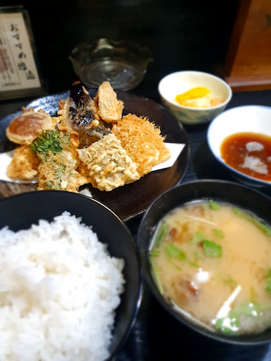 I ordered a fried meal costing 1,300 yen, and I could taste a variety of fried foods including shrimp, sweet pumpkin, squid, fish, mugwort, eggplant, mushroom, and seaweed, including miso soup.