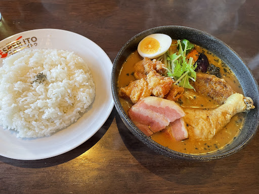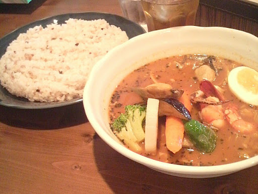 【食事】 味は一言で言うと、「普通」なスープカレーです。 スパイスのパンチ力の無さ、ボリューム感なし、営業終了間近の乾いた米が硬いです。 失礼に言うと、コンビニのインスタントスープカレーに等しいです。