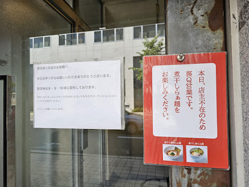 I came to the ramen shop at 08:00 and took a number for 11:30. There were only 2 of us there. One sign on the door says there will be numbers given out at 8:00, 9:00 and 10:00, the other says the owner isn't around so they will be serving a different menu (something they regularly do, I think).