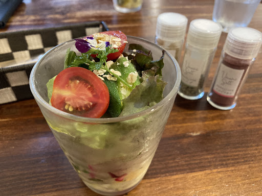 ちょうど空いていたので すぐに提供され まず サラダをいただきました グラスサラダの中には 夏野菜のマリネなど盛りだくさん 薄味で私の好み お好みでいろんなソルトをふりかけて 楽しめそう