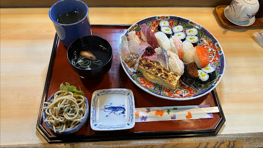 着膳した第一印象がボリュームありそうと感じました。 生寿司はマグロ、イカ、甘エビ、サーモン、サバ、玉子焼きなど10貫だけど再解凍なのか?ドリップで水っぽいネタが何種かあり、シャリは酢が余り感じられず白ご飯っぽいかな? 巻きものは8個だけど普通サイズの巻物4個を半分に切った短冊の8個です。