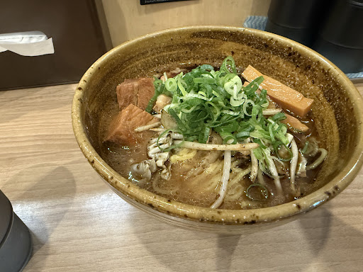 地下鉄南平岸駅すぐの激戦区。 駐車場は2台あるとのことですが、大型車は道路にはみ出すので軽か小型車以外はコインパーキングを利用しましょう。 近くに提携コインパーキングがあり、100円分のサービス券が貰えますので、駐車証明書をお忘れなく。 先客3名、並び等なし。 発券機で食券購入方式。 中華そばがオススメなのかも知れないが、こういうお店ではあえて味噌を食べてみたくなる。 札幌背脂味噌大盛りを注文。 7〜8分で着丼。 丼は口があまり広くないタイプ。 丼が小さく見える。 深さはあるので容量はあるのかも知れない。 アツアツ提供目的なら素晴らしいことだ。 ・たれ 白味噌ではなく赤っぽい。赤味噌ブレンドなのかなと思う。味は甘め。後味に甘味が残るのでこれは好みが分かれると思う。 ・スープ 特に特徴は感じなかった。 ・めん 多少ボソボソ感あり。ここは大きく残念ポイント。 麺の特性上なのか製麺のブレによるものか分からない。 ・角煮 意外にも歯応えがある角煮。ふわトロ系ではない。水々しさが失われてモッサリ感があるので、ここは改善すると格段に美味くなると感じた。 ・メンマ 太いメンマが2本入っていて、メンマ好きには堪りません。少し噛み切りにくい。 ・野菜等 炒めたてのモヤシと挽肉がいい仕事をしている。挽肉の肉感が少ない。もうほんの少し大きめに挽いてあると存在感が増すと思う。 ・その他 マー油がかけられており、苦心の末かと思うが、あまり際立つ味を感じにくい。
