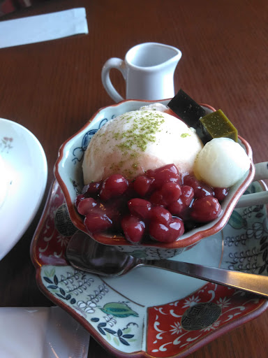Read more昔からある木造の2階建ての建物が、いつの間にか宮田屋になっていた…。 新築の平屋と繋げたのかな。とっても広く、恐ろしいくらいハイクォリティでお洒落でユニークでした。 一軒家をまるまる改造したかのような造り。中は掘りごたつの和室もあり、見学するのが楽しくなります。 1階は、複数の人がお喋りするのにむいていて、2階は静かでお一人様に向いてますね。パソコンで作業してる人も多かったな。 私は2階の、短い階段の上の窓際の不思議なテーブル席に座りました。(写真参照) ここはお一人様空間から離れて二人がけですが、ユニークでなんか癒やされた…。 この席の向かいには集団でミーティングなどに貸し出しできる大部屋もありました。とにかく広いんですよ。 今回珈琲のお供にクリームあんみつを食べましたが、寒天が手作りで、豆がしっかりしてなかなか乙なものでした。食器もかわいいです。