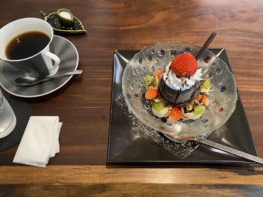 今回篠路ブレンドとベルギーチョコパフェをお願いしました。 ブレンドはほんのり甘みがあり、後味やわらかです。 チョコパフェは、コーンフレークの下地に、生クリーム、ワンスクープ分のアイス、周りにフルーツを盛り付けてあります。 本来フルーツはイチゴ、キウイ、バナナが入っているようですが、バナナが苦手な私はバナナ抜きで…(本当にスミマセン…)
