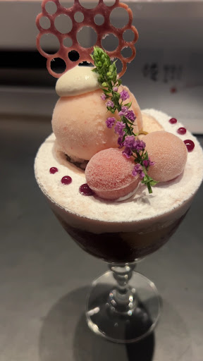 Read moreThe parfait was a stunning work of art, elegant and delicate, yet vibrant with fresh seasonal flavors. The combination of peach and plum offered a refreshing balance of sweetness and gentle tartness, perfectly layered with creamy elements and playful textures. The design, topped with a crisp decorative tuile and accented by edible flowers, made it feel almost too beautiful to eat. Each spoonful carried a sense of refinement, making it a true highlight of the night. For the small side snacks, from savory bites to a hint of sweetness, they created a thoughtful progression before the main parfait. The herbal tea provided the perfect closure, gentle, soothing,...