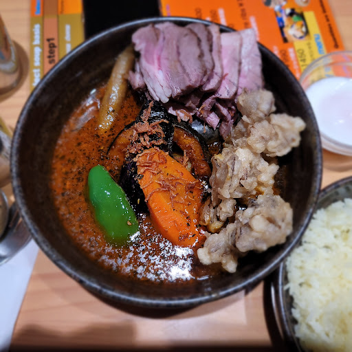 The soup curries are very tasty and satisfying, it's a Japanese fusion stew. Choose the soup, (different varieties available, from a medicinal herbal flavour to a more standard stew like flavour), choose the meat, and the degree of 'heat' you want. Down it with a nice bowl of Japanese rice, with or without cheese 😄