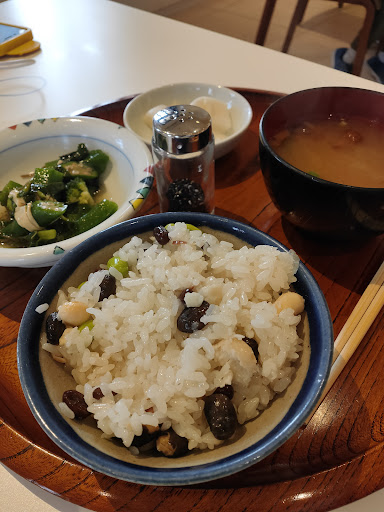 さてメニューについて。 冷凍でも販売されてるおこわが小鉢と箸休めとお味噌汁付きで楽しめるのですが、今回の小鉢はオクラと湯葉を和えたもので丁寧な調理を感じる美味しさでした。メインのおこわはツヤッツヤなんですツヤッツヤ!お家のレンチンでもこんなに艶々してなかったです、凄い。美味しい。もち米なので当然お腹の満足度は高く、多分これ頼んだらデザートお腹に入らない〜って方もいるんじゃないかな(私は普通に食べましたが)。 同行者激推しのホットケーキは、本当に普通のよくあるホットケーキでしたが、焼き加減がなんとも絶妙です。しっとりふんわりなのに、バターも染み込む柔らかさなのに、外側は見た目よりカリッと焼き上がっていて、ナイフを入れたりフォーク刺して口に運ぶのが楽しかったです。 あとピザ。ミックス、マルゲリータ、季節のピザのうち、ミックスと季節もの(チーズなし大根と味噌そぼろ鰹節乗せ)を頼みました。生地は厚みがありふっくら。サイズ小さめでしょーなんて甘く見ると「あれ意外とお腹いっぱい?」となるかも。トマトとチーズがかなり合うので、迷ったら定番のものを頼んで間違いないと思います。チーズ美味しい。大根のピザはホットサラダのようで、チーズがなくても幸せな満足感がありました。