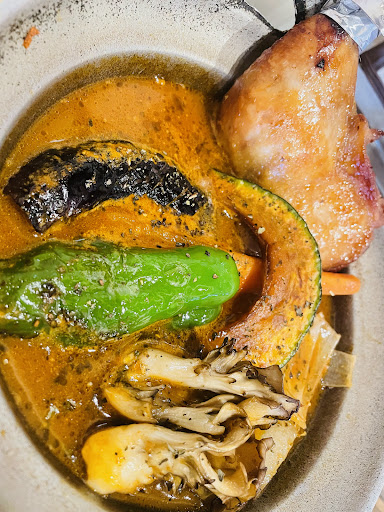 この店を初めて訪れたのは、おそらくオープン直後という記憶がある。 雪が深く、異様に寒い正月休みの夜に襲来した空腹。 どうしようもない絶望感の中で見出したスープカレーの温もり… 店内に入ると、当時の記憶の断片が次第に蘇り始めた。 律儀な店長らしき男性スタッフに「季節の野菜カレー、4番(カラ辛)、ライスL(250グラム)」を伝えると、季節の野菜カレーは他のメニューよりも時間を要すると説明された。 もちろんそれに肯んじた。 カフェのような小洒落た店内に身を浸しながら、再び過去の記憶をめくった。 敢えて言えば、このエリアでの暮らしは砂を泥で飲む日々だった。 ブラックもコンプラインスもなく、ひたすら目の前の案件をこなすことに明け暮れた。 深夜、豊平川に架かる橋をサンドイッチとビールで渡った日々。 豊平川をハドソン川に見立て、ニューヨークのパワーエリートだと自らを偽って奮闘した日を思い出していると、土鍋で煮立ったスープカレーが到来した。 薫り高いスープカレーが豊かな彩りの野菜とともに煮えたぎる。 熱さにまみれてスープを啜った。 思ったよりも辛さはないがコク深い。 美しい野菜たちは辛さに抗うようにそれぞれが味が深い。 硬めに仕上がったターメリックライスとの相性もバランスに配慮した食感だった。 食べ進める程に、過去の記憶にない味わいが押し寄せるばかりだ。 それも仕方あるまい。 長い空白が埋まることがないままに食べ終えた。