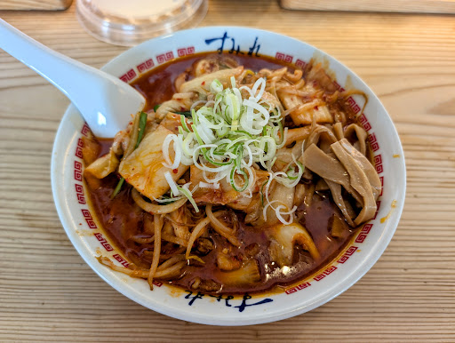 I think I might have done something sacrilegious, that is not getting the regular miso on my first visit here. Since I already got a taste of JunSumi-kei at Junrei, I kinda wanted to try something different and this kimchi variant of miso ramen at Sumire caught my eye. Among the 3 famous shops (Sumire, Junren, and Saimi), I think Sumire serves the oiliest bowl so far. The layer of oil was so thick that it scared me quite a bit seeing it in person. It was hard to get the first sip of the broth without scooping up a copious amount of oil. Nevertheless, I do think that the concept of kimchi in miso ramen works as a spicy version. The crunch that the kimchi provided was quite nice. There was so much kimchi in my bowl that I don't think you even need the menma anymore. I quite like how they basically stir-fried the kimchi and dyed the red chili color directly into the miso broth. Instead of the regular chashu, they also tossed thinly sliced pork into the wok. While the flavor profile worked out, this was also the least impactful bowl of miso I got so far on this Sapporo trip. I think the kimchi pretty much mellowed out the intensity of the miso while barely adding much heat...