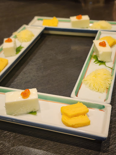 The restaurant is divided into individual tables, with an Omakase area nearby. Even though we didn’t book the Omakase experience, we could still watch the chef prepare sushi and slice fish fresh for us. Before our ordered dishes arrived we were served an appetizer to start.