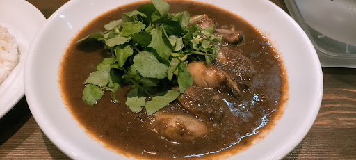 今回の注文はSNSで見ていた9月限定「チキンと米茄子のカレー」に辛いマサラ・味付け玉子、そして好みであるクレソンを追加した。 ・ 大きな楕円形の皿にタップリとカレーが盛られている。そうそう、やっぱり玉子の黄色とクレソンの色合いが良くて食欲を擽りますなぁ〜。 カレーには大量の擦りおろした玉葱が使われていて、その旨味・甘味は独創的だ。辛いマサラを追加したので、食べ進むとジンワリと辛さが増して来る所がイイですねぇ〜。 ・ カレーと具材をライスの方へ掛ける方式でガツガツ食べ進み、玉子の黄身・茄子・カレー・ライスが合わさった時は、今日イチのニンマリ。ナンプラーと和出汁に漬けた玉子が美味しくて、次回は二個入れにしようかなぁ。