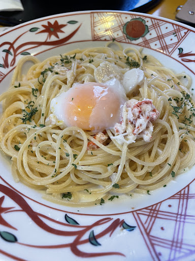注文したのは、14番の紅ズワイガニと帆立のクリームソース温泉卵添え。 パスタの茹で加減はちょっと良い。そして味付けも、ちょうど良い塩味。美味しいパスタ。お箸で食べるスタイルも悪くない。