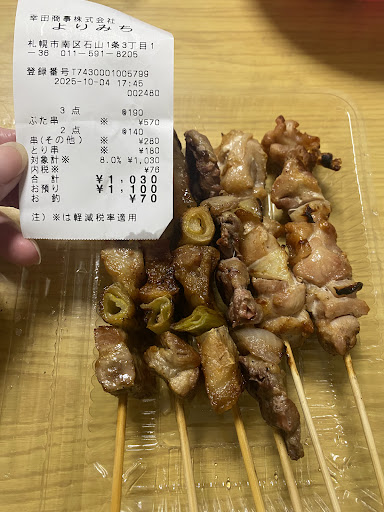 Looks like where the locals like to hang out. Be prepared to make reservations. Generous amount of meat for yakitori. Superb value for money and amazing taste. Will absolutely recommend to drop by if you are looking for a non touristy joint. Worth driving over from Sapporo city. We had all these for less than USD 43. Too busy eating and forgotten to take pic of the grilled fish 😬 Yakitori + crab porridge + fried oysters + Squid salad + grilled sea bream + 2 highball (generous w alc...