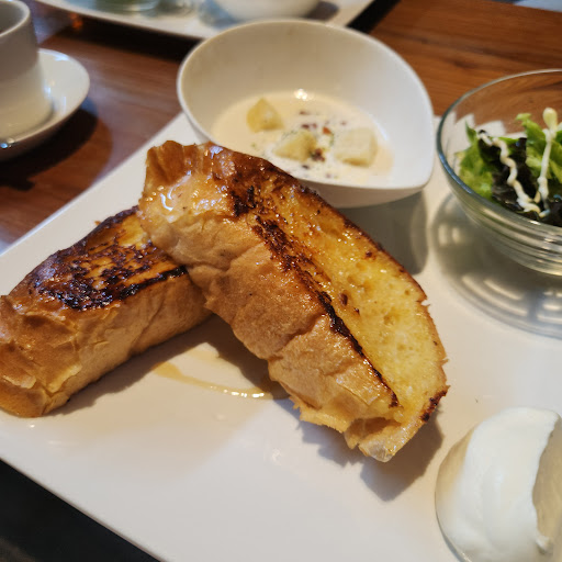 駐車場が広くて良い。 店内は雑貨屋?と併設な店構え。 どちらかというとスイーツとドリンクがメインなのかな。 ランチタイムだったので、ハンバーグプレートをフレンチトースト変更で注文。 フレンチトーストがデカいw 味もヨロシイ。 ハンバーグは小振りだが付け合わせのソースとが良いマッチング👍️ セットドリンクのアイスコーヒーも美味しい😋 まぁ、ここまでは誉めておきます。