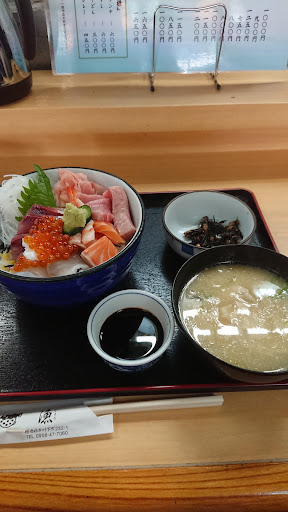 ①昼は12時の時点で順番待ちの紙はビッシリ埋まっている状況。人数と車のナンバー、メニュー表も置いてあり希望メニューまで記入して呼び出し待ち。一人だったからか運良く記入してすぐ入店。本日は海鮮丼+あら汁 1150円をチョイス。日替り900円刺身付きも魅力的。海鮮丼はハマチ三切れ、サーモン三切れ、鯛三切れ、マグロ中トロ三切れ、タコ二切れに海老が一尾とイクラが掛かっており見た目から豪華な感じ。醤油は別添えでしたがわさびを溶かして掛け回しました。ご飯は酢飯で少し甘め。刺身も一切れ一切れが多く満足感があります。かなりボリュームがありご飯も多めのため少食の方はご飯少なめと先に伝えた方がいいかもな量でした💦中トロが脂が甘くかなりお得に海鮮丼食べれたと思います。あら汁も鯛のあら汁で皮のゼラチン部分が贅沢に残してあり美味しかったです。