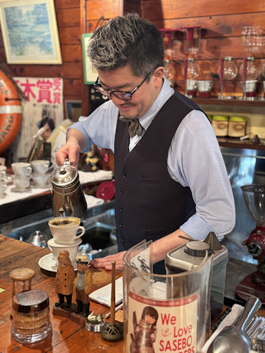 ย ย ย Read moreThe ONLY place to go in Sasebo if you want artisan coffee. "Kunimatsu" is run by Hiroki-san and his mother, and he specializes in siphon filter coffee via alcohol burner. Stepping inside is like going into an old sea cabin, all of his coffee drinks are served in separate porcelain styles from Arita. He features coffee from around the globe, and other unique brews such as his "Dutch" coffee, an 8 hour cold brew. There's a small selection of food here as well, ranging from fruit smoothies, to ice cream, to cheese sandwiches, and he has a small drink bar for "adult" coffee.
