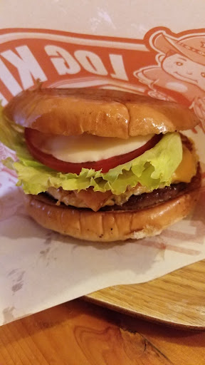 Grilled patties with toppings & fries at a casual restaurant with log cabin-inspired decor.