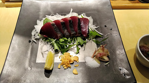 最初の1杯目は隅田川ブルーイングとか言うビールを頂きます。コレ、旨いですね~‼️口の中に広がる香りが良いっ‼️ 付だしはミートボールだったのでちょっとガッカリしたのですが、柚子の香りのする餡がかけられていて思わず「旨っ❗」って言ってしまいました。こういう想定外の感動って良いものですよね~♪ 食べたかったのは本日の貝刺身。北寄貝かツブ貝の刺身だと良いな…と思っていたのですがサザエということで却下 カツオの塩タタキがあったのでソレとお店の外のボードに馬のレバ刺があるみたいなのをチラッと目にしていたのでソレを頂きます。 カツオの塩タタキは四国で頂いて感動した1品。 環境の違う佐世保で食べて美味しいのか… 不安と期待の入り雑じる中やってきました、カツオの塩タタキ‼️ アレ⁉️ニンニクが生のスライスじゃない❓フライドガーリック❓ ミョウガは同じか… ちょっと失望のまま、とりあえず頂きます フム…意外と合う❗意外と美味しい‼️ コレはコレでアリだな、うん。 そして引き続き出てきたのが馬のレバ刺 馬のレバ刺なんて珍しいモノに出会えるなんて‼️ でも大事なのは味。 いや~、こちらもコリコリとした食感にレバーの旨味がゴマ油のフレーバーと共に広がって最高です。一応、レバ刺にはゴマ油と塩でってことで供されているのですが、生姜が載っていたので刺身醤油と生姜でもパクリ…いや~、コレも旨い。幸せ~♪