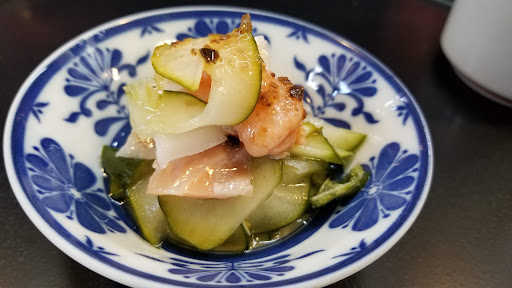 初訪問でした。 事前にお店に連絡して、お昼に伺いました。 11時30分から営業されているそうです。 店内はカウンター6名、テーブル2名で そこまで広くはありませんでした。 お昼時でしたが、他にお客さんはいなかったので 気を使わず滞在できました。 お店の方がとても雰囲気がよく 連絡した時から、印象が良かったです🎵 初めての人にも、優しく対応していただいて感謝でした。 上にぎりと茶碗蒸しを注文して まずお通しが出てきて マリネをいただきました!! とても美味しかったです。