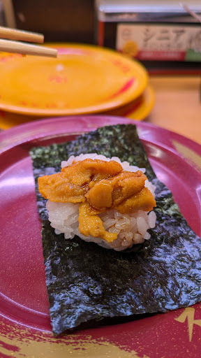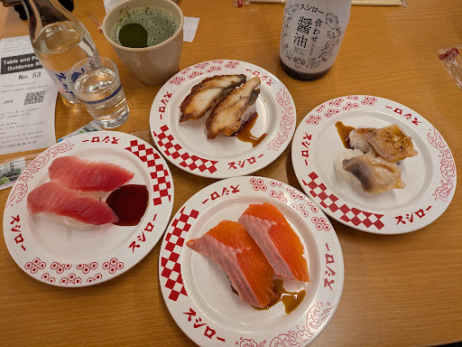 Read moreSushiro is a great place to get sushi in Japan. It doesn't get more Japanese or more efficient than great, fresh conveyor sushi. In case you didn't know how this place works, you will be seated at a booth and left to your own devices. Grab your cup from above the conveyor and make some matcha tea with the matcha on the table and the hot water spout under the conveyor(use chopsticks to stir), grab 2 small dishes from above the conveyor and put soy sauce and pickled ginger in them(both on the table), grab your sushi from the conveyor and eat! White and yellow plates are 100 yen (about $1 currently) and the premium dishes aboard the black plates with gold glitter are 280 yen. DON'T GRAB PLATES ON THE RED TRAYS AS THEY ARE SPECIALLY ORDERED. To order something specially for yourself use the touchscreen, which will alert you when your special order is approaching your table. There is an English option for the touchscreen. Seriously a good deal for sushi and the best sushi I...