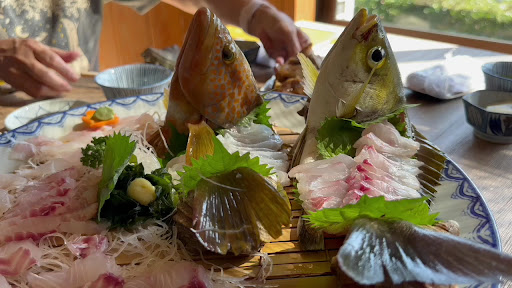 Read moreいただきて来ましたよ活き造り! 場所は西海橋と新西海橋の中間に位置した場所。新西海橋公園から少し降ってゆきます。車でも行けますが、駐車場は3〜4台と少なめで大きい車だと狭く感じるかな。私たちは半端な時間に訪れたので私たちの車と、お店スタッフ様の車かな?だけでした。駐車場から少し歩きます坂道を下ってゆく感じ、右手の擁壁に野生?のアロエ?がいっぱい生えていてビックリしました。植えたのでしょうね。