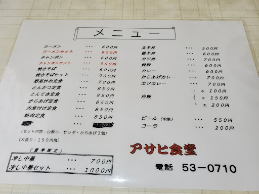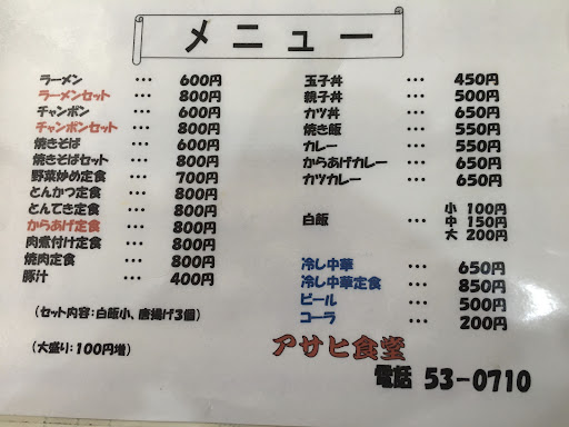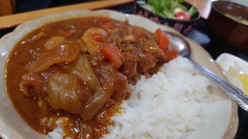 店内はこじんまりとしていながら、4人掛け座敷席3卓、4人掛けテーブル席3卓、カウンター3席です。隙間を縫って移動せねばならず、かなり密な配置になっています。 平日12時過ぎに行ったのですが、あっという間に満席。お客さんは9割が働くおじさん。役所っぽい人と作業服の人でした。 人気メニューはラーメンセット800円。ラーメンにからあげ3個と小ライスが付いています。8割がこれを注文。 今回はカツカレー650円と親子丼500円を注文。カツカレーは玉ねぎ・人参・じゃがいもがごろごろとした、家庭的なカレーでした。辛さはかなり控えめなので、お子様も大丈夫かも。親子丼はプリプリの鶏肉にもしっかり味がついており、半熟の玉子がトロットロで最高でした。どちらもサラダ・具だくさんの味噌汁・漬物が付いていました。リーズナブルですね。 とても美味しかったです。ごちそうさまでした。