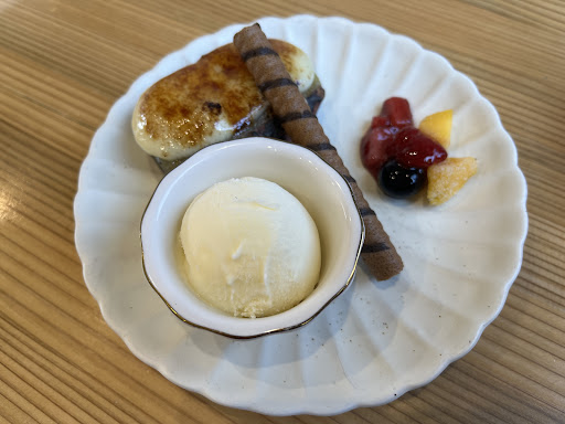 それで肝心の料理ですが、タルタルはやや甘ったるく、ネギ塩ダレはやや塩辛い…かなと。子供の唐揚げと私のエビを交換して食べてみましたが、冷凍唐揚げっぽい味です。全体的に手作りと既製品を組み合わせた料理という感じです。 セットのランチデザート(別途320円)も同様。