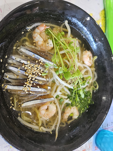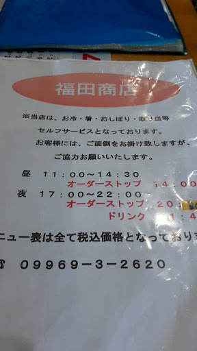 とても暑い昼下がりに主人がおすすめのランチが美味しいという福田商店を訪れました。オーダーストップ18分前でした。いらっしゃいませて言われたようなないようなーテーブルにおかれたメニューのなかから他のお客さんがラーメンらしきものを食べていたので私もと思い、きびなごがトッピングされたラーメンをオーダー。お水は、セルフでと声がかけられ、冷えたお水を紙コップで二杯飲み干しました。店内は、クーラーがよく効いていて最高。間もなくラーメンが配膳され、スープをのむとなんと美味しいスープでした。色とりどりのあられと 光ったきびなごがとても綺麗な盛り付けでした。汗をたっぷりかいていたので魚出汁、甑の塩スープがとても美味しく感じました。 次は、定食たべたいな。