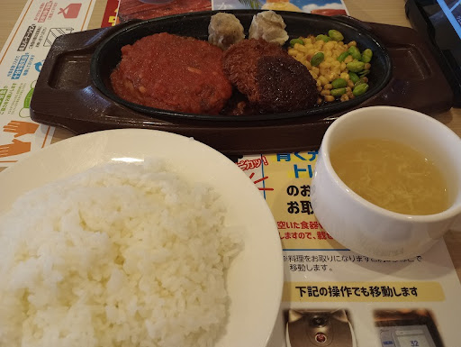注文したのは日替わりランチ604円。中身はライス、スープ、ハンバーグトマトソース、カボチャコロッケ、シュウマイ、付け合わせ。 ハンバーグ、ライス等の味や量はごく一般的。いわゆるチェーン店もので良くも悪くも普通。なおライスは大盛り無料、スープはおかわり自由。