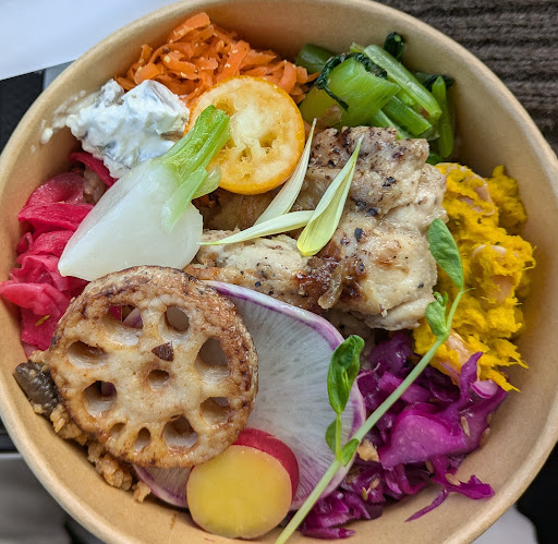 店頭、イベントなどで購入させていただいております。 丸い容器の中、ご飯の上にたっぷり彩り豊かに溢れるお野菜たち 「おひべん」だからこその、この調和、ハーモニー。見た目そっくりのお弁当は数あれど、この調和は「おひべん」だけ。 おかずの味をひとつづつ確かめてもいいし、混ぜて食べてもこれまた美味しい。