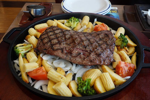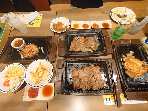 Read moreたまたま目にした期間限定の「REDステーキ」を目当てに、数年ぶりに来店。店は10時から開店しているのが良いですね。混み合う前に来店したので、サラダ・ドリンクバーもゆっくり利用できた。さて、料理は直径40cmはありそうな大きな鉄板に500gステーキと付け合わせがたっぷり。 肉はみすじなので赤身肉。とても旨い。「RED」は辛みでは無く、赤身の事ですね。塩胡椒の加減も良く、焼き方もミディアムレア(かな?)で柔らかい。焼きペレットも提供されるので、焼き具合を調整できるのも良い。ソースは5種類あり、肉の塩加減に合わせて若干薄味となっていたが、最後まで飽きずに食べられた。肉が来る前には量を警戒してカレーやサラダは少なめに食べていたが、肉は完食したものの付け合わせが多くて満腹に。さすがに連れに手伝ってもらった。こちらの店員さんはテキパキしていて、接客態度に好感が持てた...