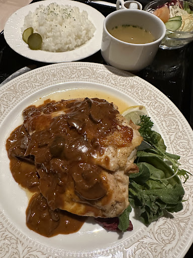 Read more今回宿泊した宝泉坊ロッジさんでは夕食を食べる場所が無いので両サイドにあるレストランに行くしかありません。 前日のお昼は温泉施設のクアテルメさんに行ったので今夜は食酔坊・宝さんへ。 19:30頃の入店、先客は2組ほどで10名くらい。 メニューを見て…かなり迷いました… 和洋中色々なジャンルがあるのです… 結局、奥伊予地鶏が推しとみて奥伊予地鶏のソテーのセットと城川ベーコンソテーをオーダー。 城川ベーコンはホテルのスタッフからおススメと聞いていました♫ しばらくしてベーコンソテー登場! 厚切りで脂が非常に美味い😋 そして奥伊予地鶏♪ コレまた大判で柔らかくジューシー! 鶏肉をデミグラスソースでソテーとはやりますな! 大判鶏肉にはヤングコーンとインゲンが隠れてます!(◎_◎;) ベーコンとご飯にはピクルスもありコレまた美味し😋 また新しい美味しい食べ物を発見してしまいました...