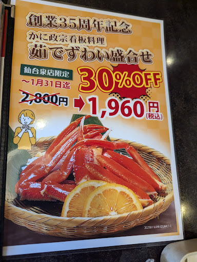 冷凍技術の進歩は、私達日本人の食生活を豊かにした。 その一例が、ここ かに政宗。 生きた毛ガニは勿論、タラバの刺し身、焼きをリーズナブルで味わえる。 かにと言う屋号の割には 居酒屋並みのメニュー展開。 そのメニューをよ〜く目を凝らしてみれば、 どこかで見たメニュー、 どこかで見た皿、器、 どこかで見た料理。 そう、まるまつグループだ。 しかし、あくまで『かに』を前面に押し出し、 その周りをアリが通るスキを埋めるべく まるまつのメニューを移植したかのような。 勿論、全てではない。 が、その結果、かに好きな女性から、焼き鳥にビールのオッさん、デザート目当てのお子ちゃま達のハートをつかみ、 ランチでは手頃な価格で主婦層、OL層のハートをわしづかみし、 その結果、駐車場はいつも満車。 予約して行く始末だ。 特に週末、家にお母さん方、女子率が高い時は予約して行くとスムーズに食べられて、お父さん方のポイントは上昇間違いなし。 ちなみに全室禁煙だが、店の入り口に灰皿があるので、家庭の換気扇、ベランダで吸ってる仲間には有り難い話だ。 ただし、ホントの冷凍ではない、チェーン店でない高級なお店よりは味は落ちる。 値段も安い。 が、ほぼ完璧なラインナップには脱帽だ。