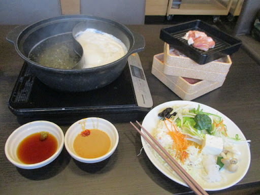 皆さんご存じのとおりのすかいらーく系のしゃぶしゃぶ食べ放題のお店。先月にゆず庵に行っているので,ふた月続けての食べ放題。 基本的には、豚しゃぶのみのコースから選べるシステム。連れ合いから、豚だけじゃ飽きない?とのことで、牛肉付きのコースを選択。出汁の味は基本2種類。追加料金で4種も選べる。 で、ゆず庵との大きな違いは、寿司がないことではなく、タブレットで注文するのは、肉だけということで、肉以外はすべてセルフ。たしかに、この方が、食べたくない野菜や頼んだら「あれ?」というものが運ばれてくることもなく、無駄が最小かも。 また、みんなが同じトングを使うことに抵抗がある方もいるでしょうということか、ビニールの手袋を付けながらトングを使うことになっていました。 気になるお味ですが、つけるタレの種類がとても多く、ポン酢とごまだれのみということではなく、いろんなお味が選択でき、また、薬味も紅葉おろしのみということもなく、豆板醤なども選べるようになっていました。 最初入ったときに、子ども連れが多いなと感じたのですが、それもそのはず、ソフトクリームがあったり、綿菓子があったり、ワッフルがあったり、デザートのコーナーが充実していて、さらにそれらを自分で作れるのだから、子どもは喜ぶでしょう。 ということで、味は問題なくおいしくいただきましたが、テーブルや座席がちょっと狭いなという感じがして、窮屈な印象がありました。 そういいながらも、休日の12時半にすんなりと座れたのはとてもラッキー!でしたので、星3...