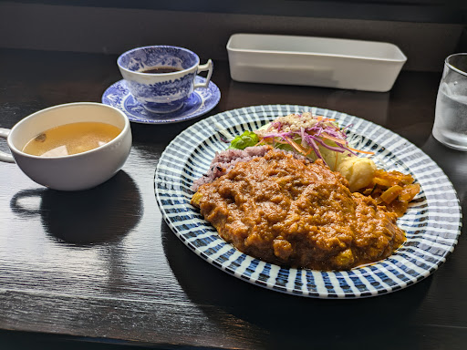 ランチの特製チキンカレーを頂きました。 やや甘めで香辛料がすっとくるチキンカレーと、古代米の珍しい触感が非常に食べてて楽しく美味しいです。