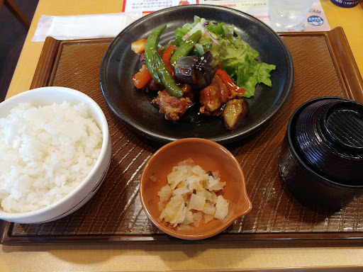 Read more日曜日のお昼前に行きました。 8割ほど席は埋まっていましたが、直ぐに窓側の席に案内されました。 妻はナポリタンセット、自分は若鶏と彩り野菜の黒酢あんセットごはん無料大盛りを注文。 妻のナポリタンが運ばれてきましたが非常に量が多く、食べきれないのでと私に3分の1程よこしましたが、味に深みは無いものの程よいトマトの酸味のソースが適度な堅さのパスタが絡みで美味しく頂きました。 黒酢あんの方は鶏の唐揚げに黒酢あんが絡み美味しかったです。 食べ終わる頃にスタッフが来て、間違ってパスタを大盛りで出してしまったらしく、普通盛りに金額を訂正して頂きましたが、全て食べ終わっていたので申し訳なく思いましたがラッキーでした。...