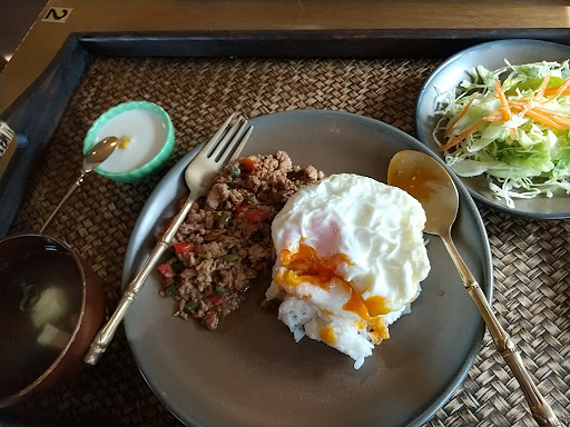 鶏か豚肉のバジル炒めを頼んだのに、バジルが入っていません!! ※お店から返信をいただいたので、下の方に追記しています。 店員さんに聞いたら、最初は「入ってます」と言ったのに、どこに入っているのか実際に見てもらったら「今、バジルが無いから香りだけつけてます」と。。 それは、日本では、「入ってない」というのですよ。 返信で「正直にオイルを使っていると言った」と書かれていますが、最初は「バジルは入っている」と言った後にどれがバジルなのかこちらに指摘されてから「今はバジル無いから香りのオイルを使ってる」と言い直したのは、"正直に言った"といえるのか微妙なところですよ。 バジルが無いならメニューに載せるか、オーダーしたときに言うか、もう近くのスーパー(最悪ドライバジルならいつでもほぼどこのスーパー)でも売ってるんだから買って提供していただきたいです。 タイやベトナムなどに行って同様の事をされたらまぁ仕方ないと思うけど、タイ料理屋さんだけど日本で営業されているので、最低嘘を言ったりメニューと異なるものは出さないで欲しいです。 サラダのドレッシングも今までで一番少なく薄く、私の口には合わなかったです。 デザートはココナツミルクの中に緑色のタピオカ?ゼリー?カエルのたまごみたいなのととうもろこしが入っているもので、これは好みが分かれそうですが、私は緑色のものは食べられなかったです。 因みにカオマンガイはとても美味しかったです。 今回は残念でした。