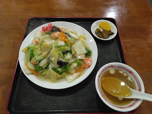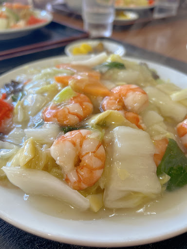 焼き目のついた細麺に塩味のえび入りあんがかかっている焼そば。 えびはプリプリ、餡はしっかり味が付いておいしい。 スープはおかわりしたくなる程旨い! 店内には、小上がり3テーブル、椅子席テーブル3つです。